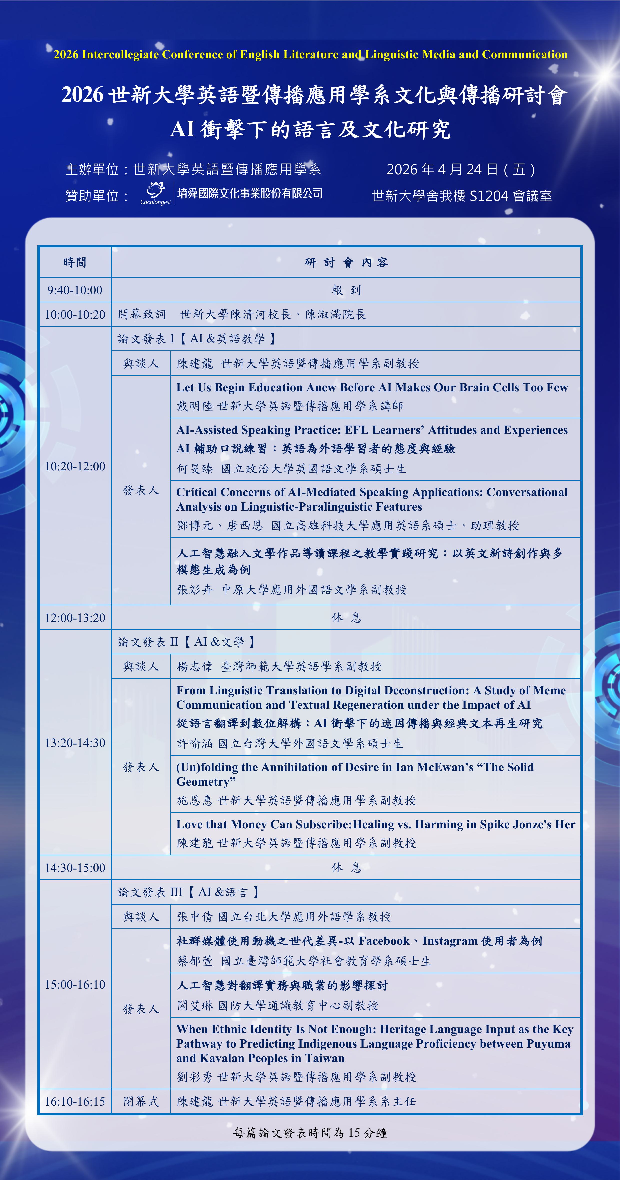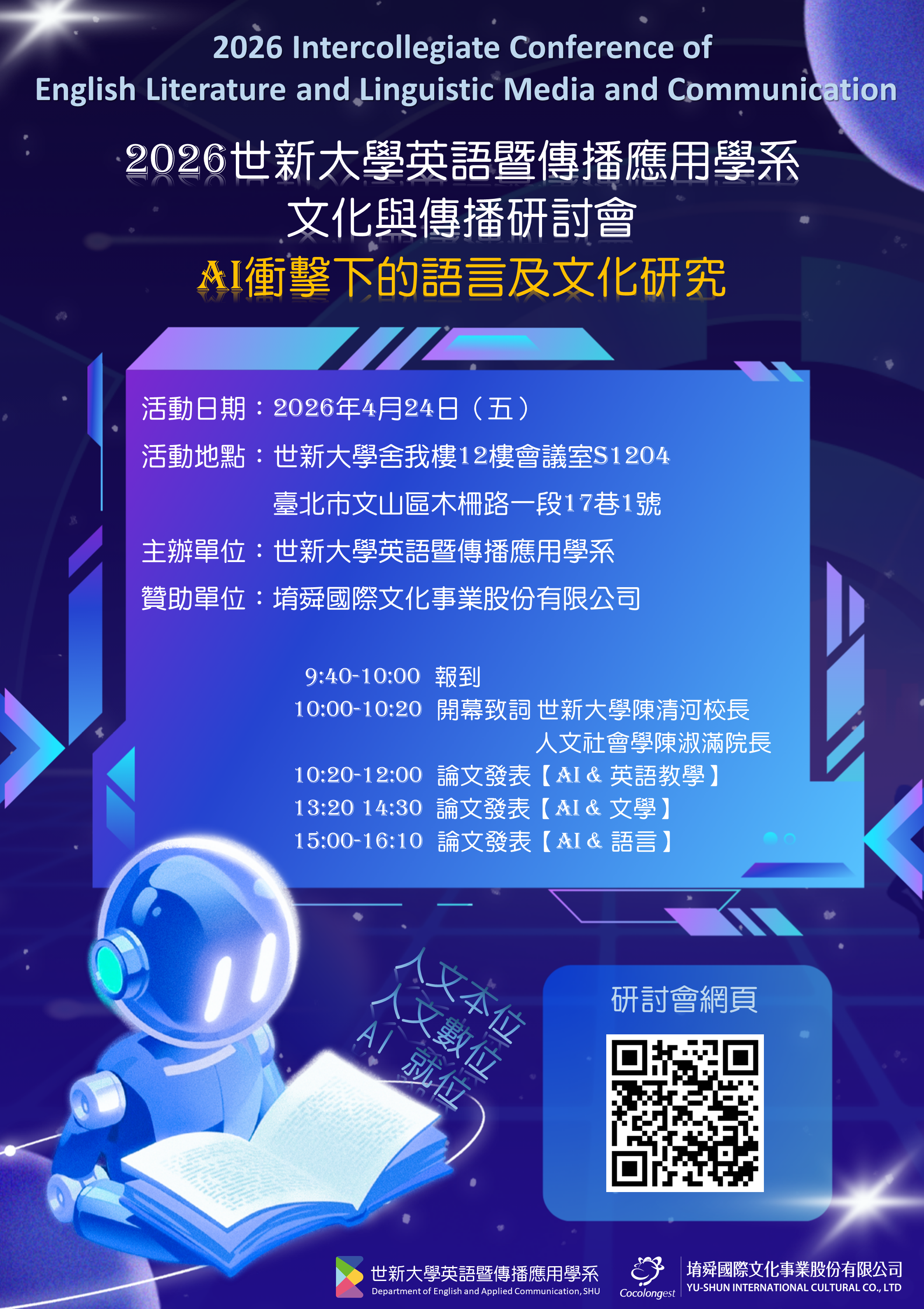 2026世新大學英語暨傳播應用學系文化與傳播研討會 –AI衝擊下的語言及文化研究